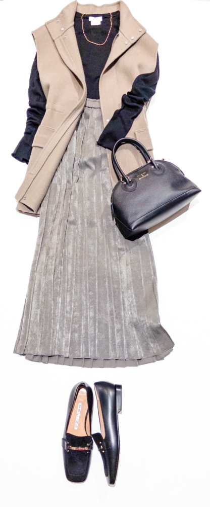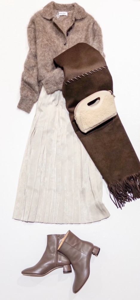 スエードのような滑らかな質感が、動くたびに上品な艶めきを放つプリーツスカート。