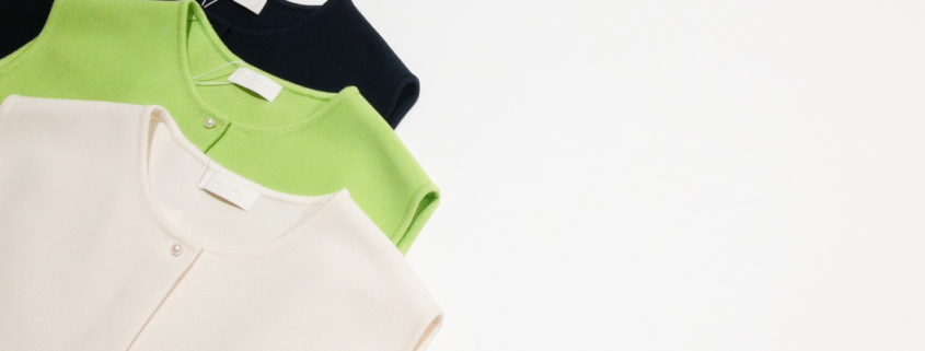 流れるようなフレアシルエットと上品なパールボタンが魅力のベスト。